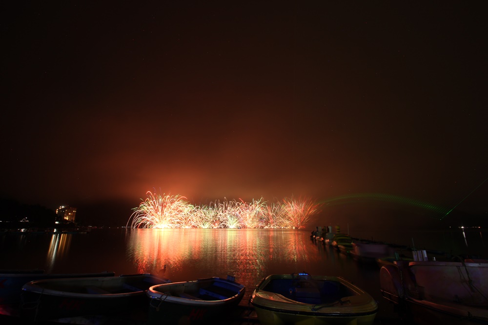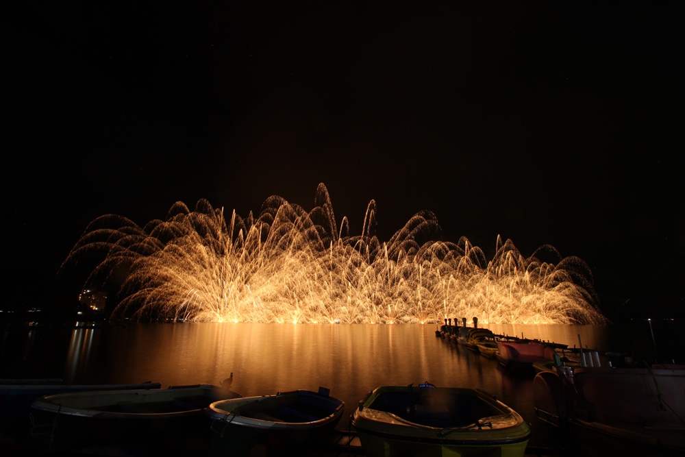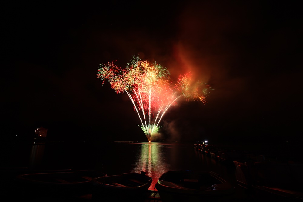 榛名湖花火大会榛名湖上をボートで走りながら花火を落としていく、名物の大迫力湖上花火。台船から打ち上げるスターマインとの共演です。主催:榛名の祭り実行委員会